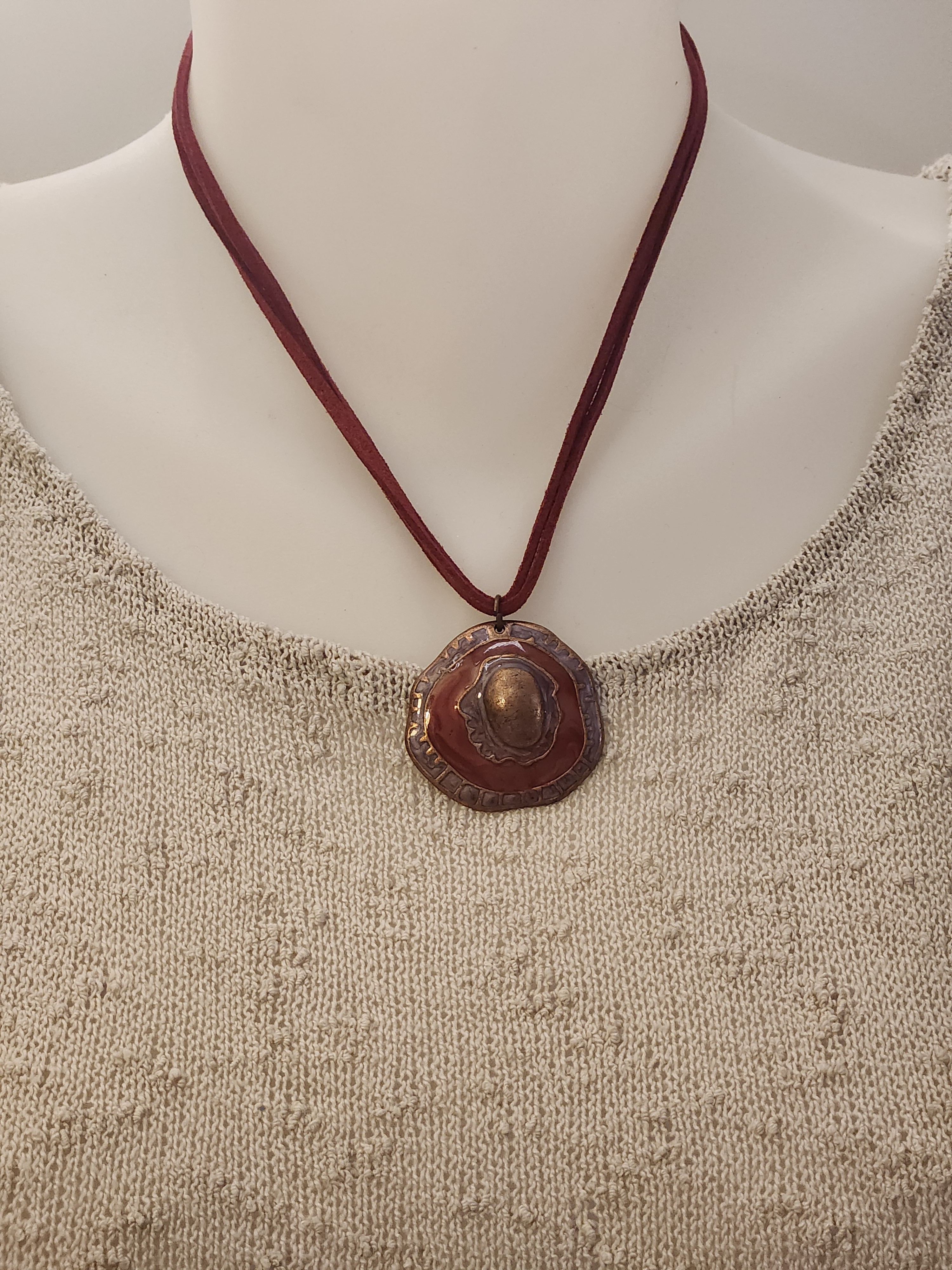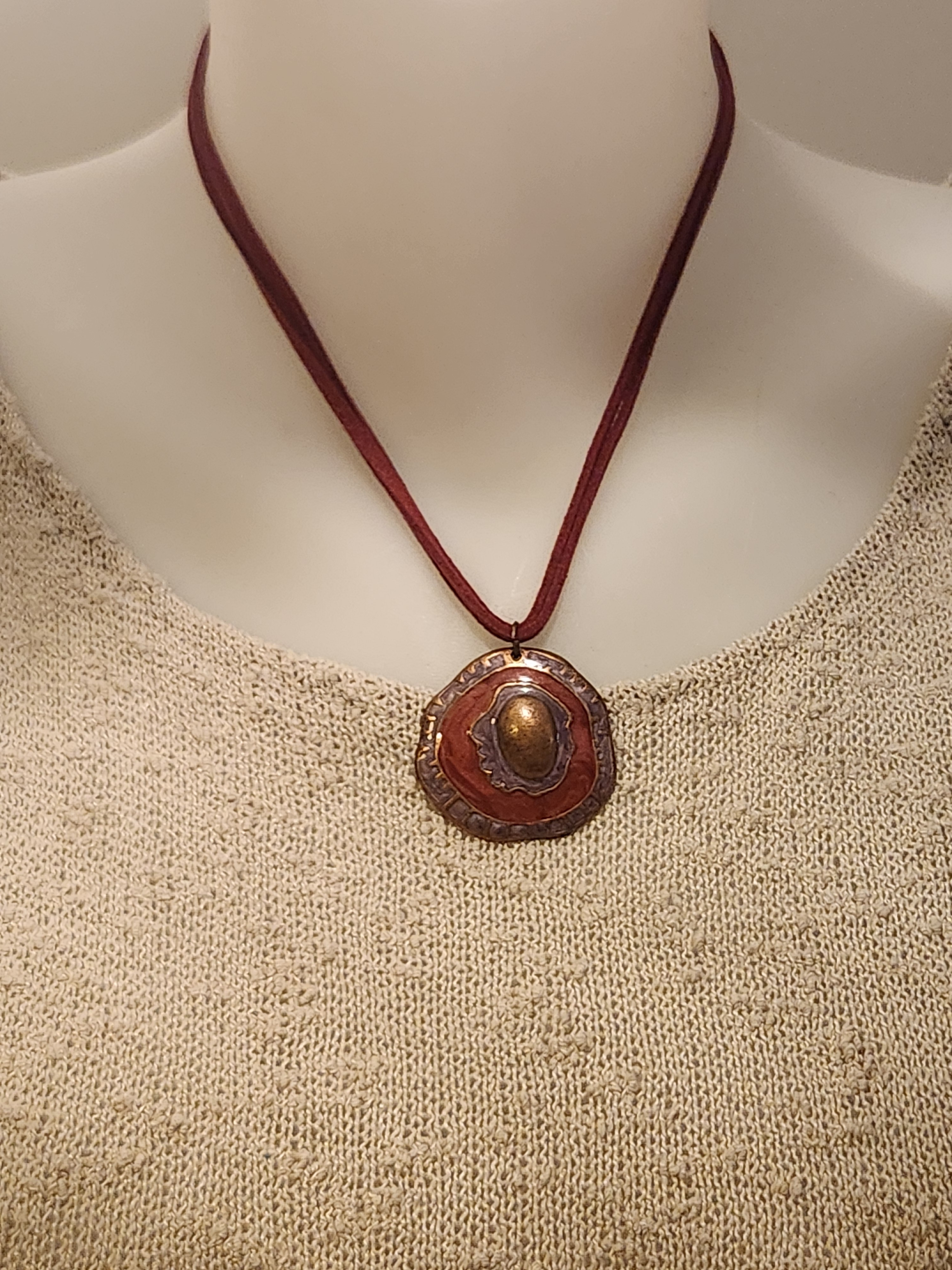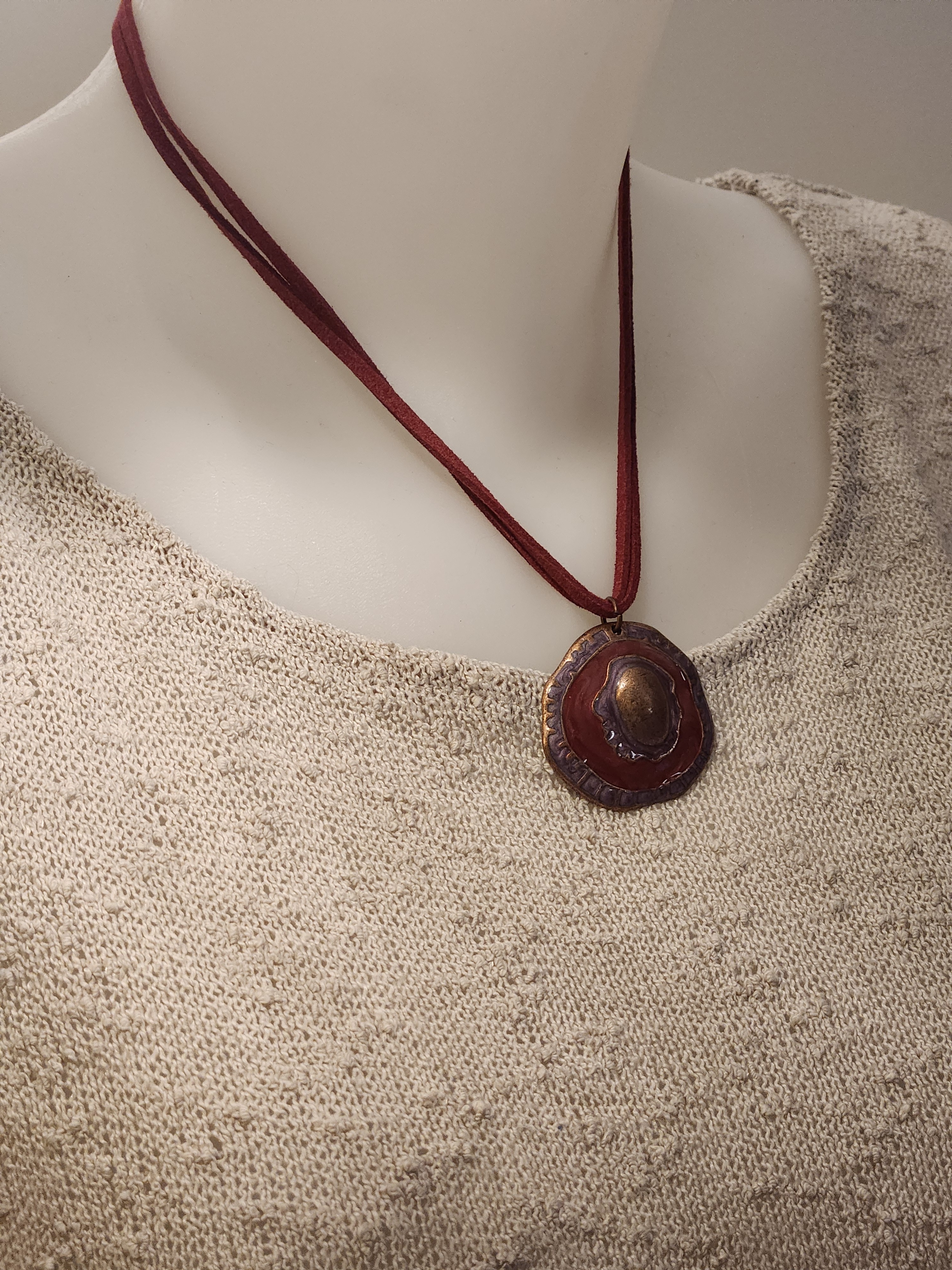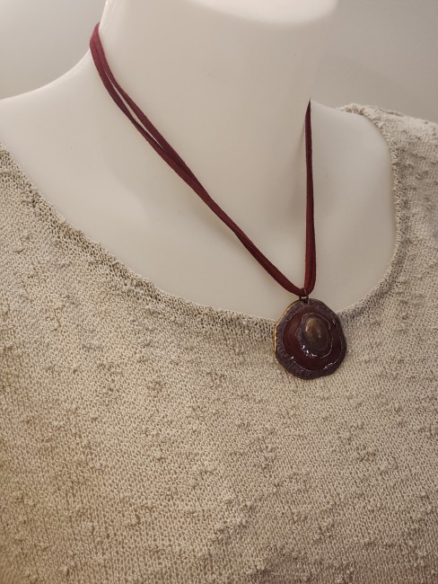 Je vous propose ce pendentif de métal en cuivre, il est émaillé dans les coloris violine et pourpre.