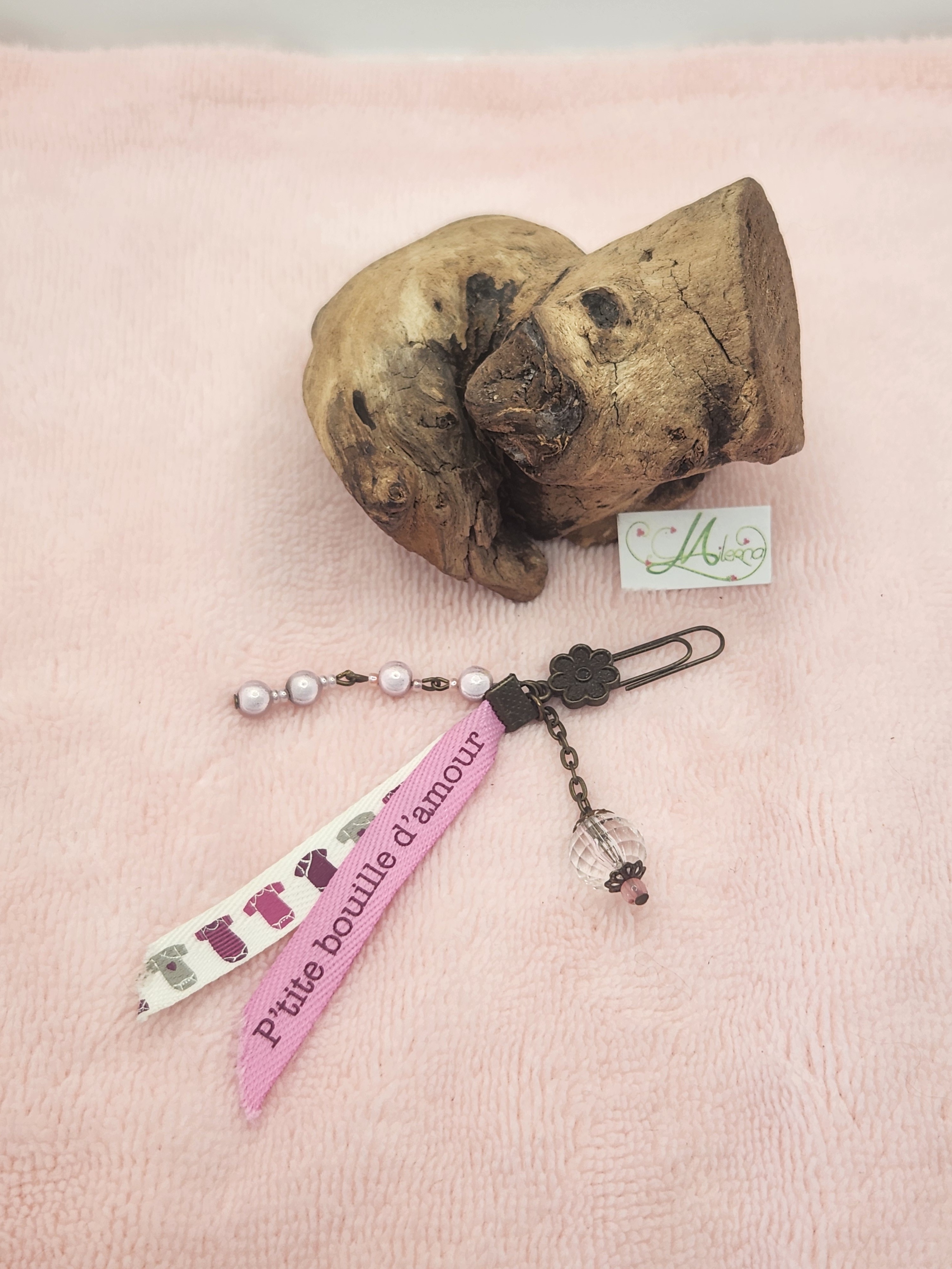 Il se compose de perles rose, ainsi que de deux rubans "petite bouille d'amour" et "des bodys"