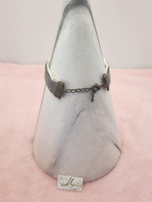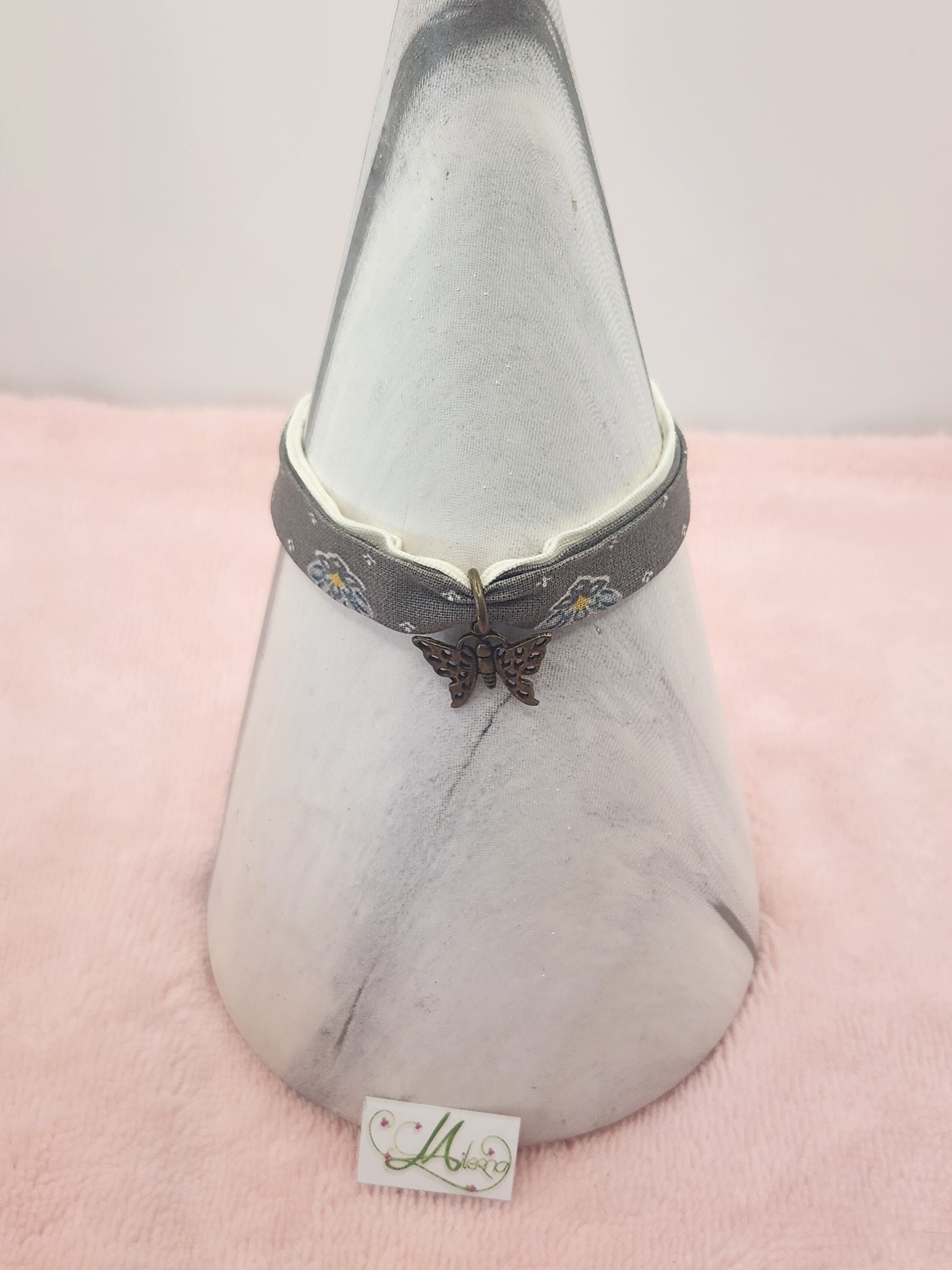 Je vous propose ce bracelet Liberty gris, fleur de lotus/crème, taille adulte, breloque bronze papillon.