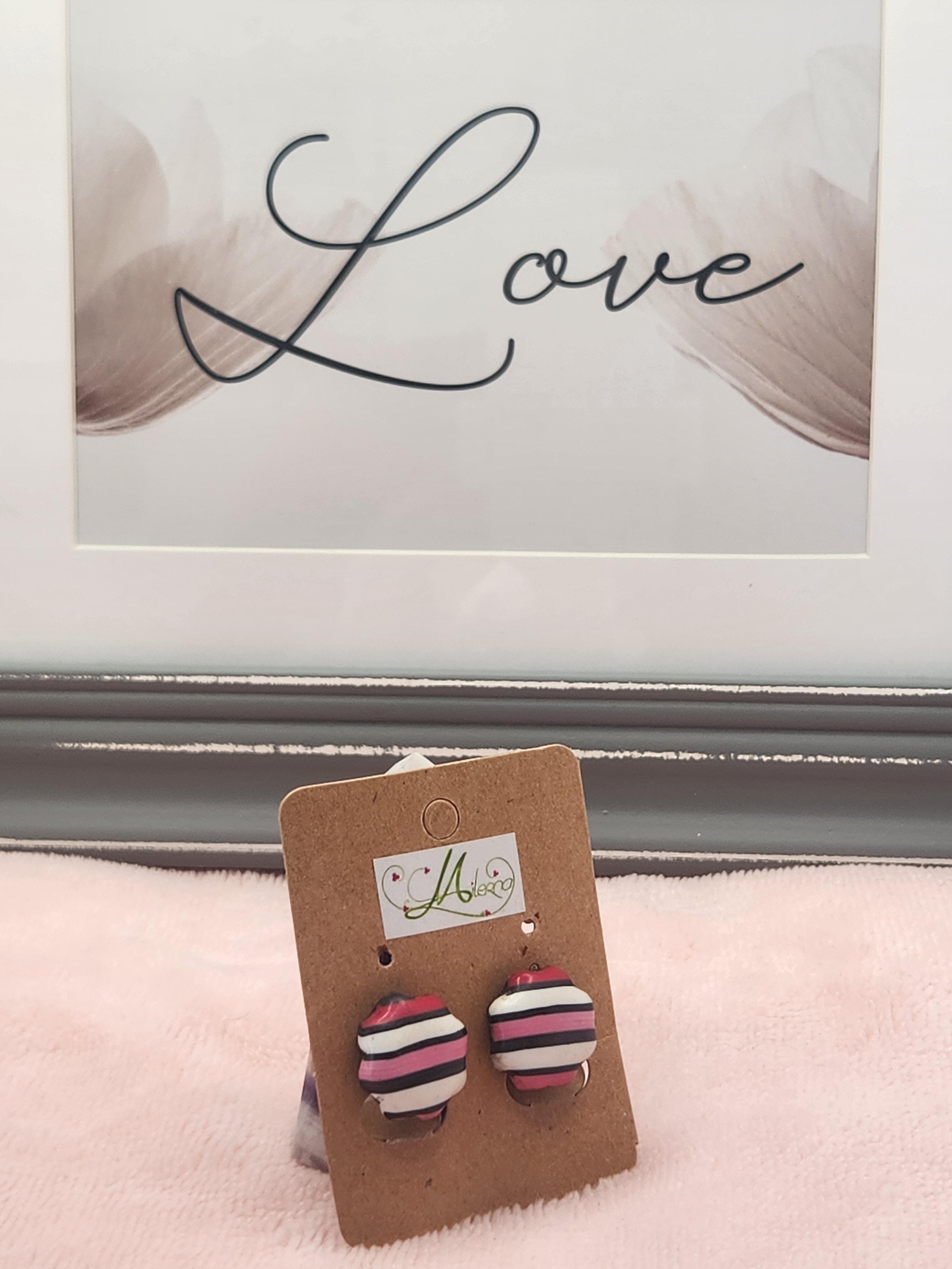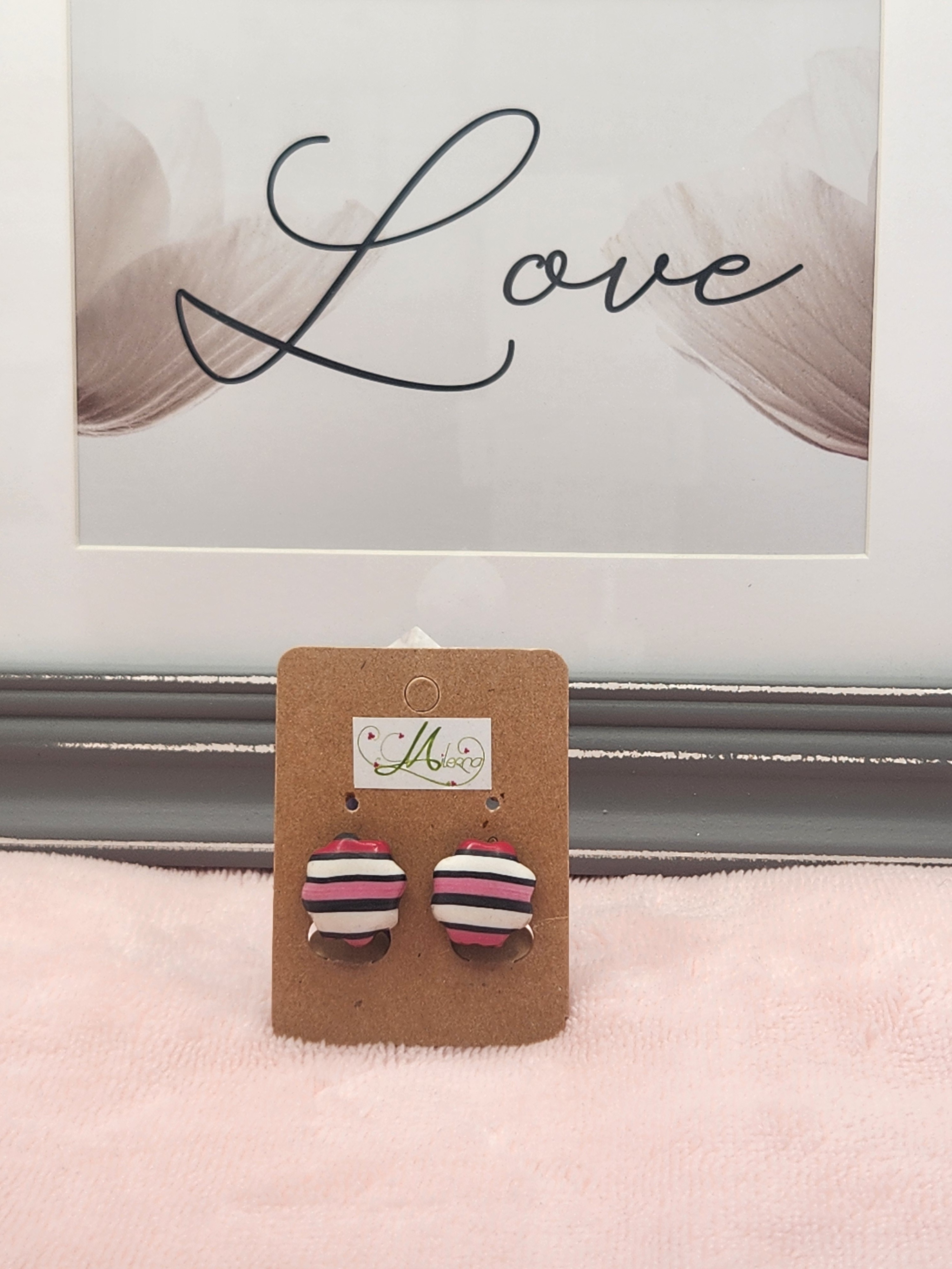 Je vous propose cette paire de boucles d'oreilles rayée blanche, rose et noire en polymère.