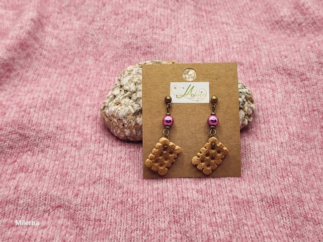 Boucles d'oreilles petit biscuit gourmand en polymère avec des perles roses