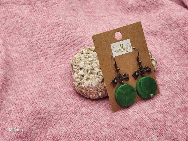 Paire de boucles, ton de vert en polymère, petit nœud en bronze