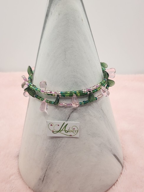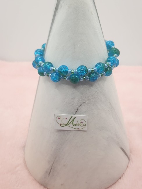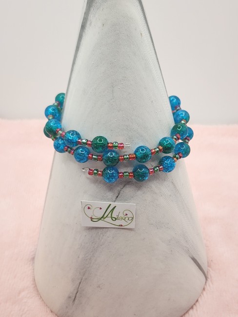 Bracelet en perles coloris bleu/vert et rouge transparente