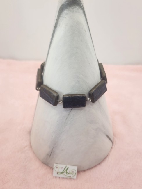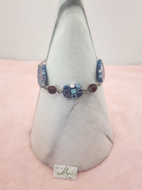 Bracelet perles plates, de coloris bronze, bleu gris et rouge.